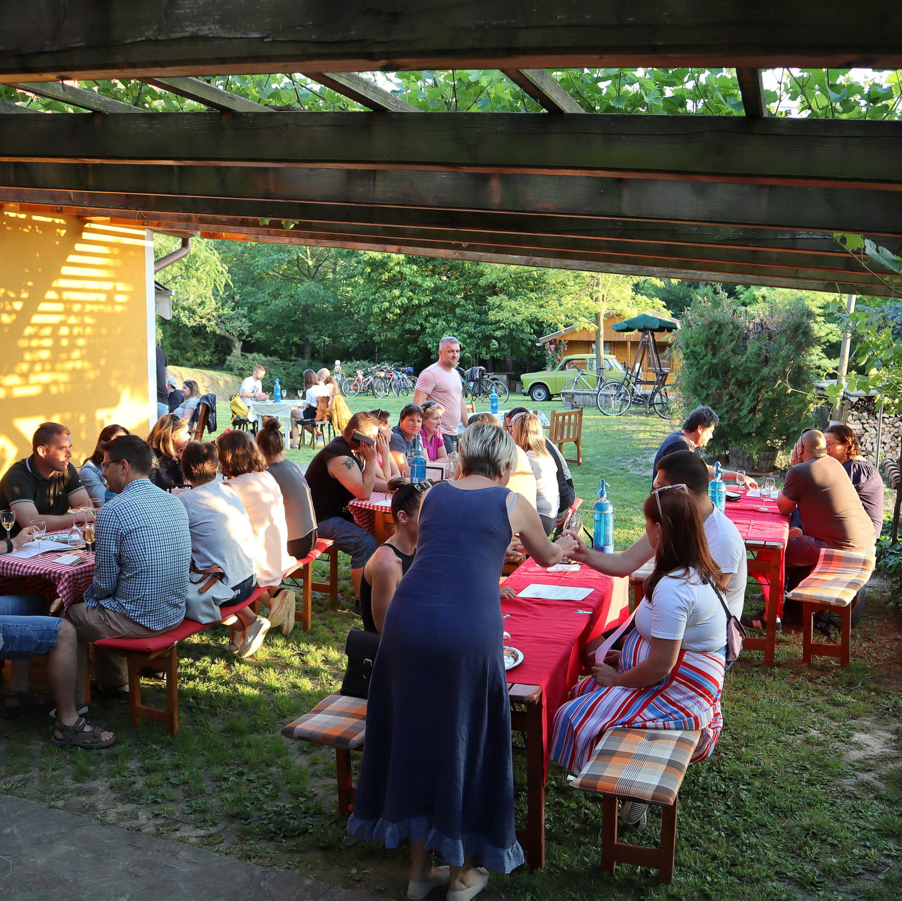 A présház előtti nagy kertben amíg a szülők bort kóstolnak a gyerekek szabadon játszhatnak, jó időben a szőlőlugas alatt lehet beszélgetni, falatozni, élvezni borainkat és a hely szépségét, nyugalmát.